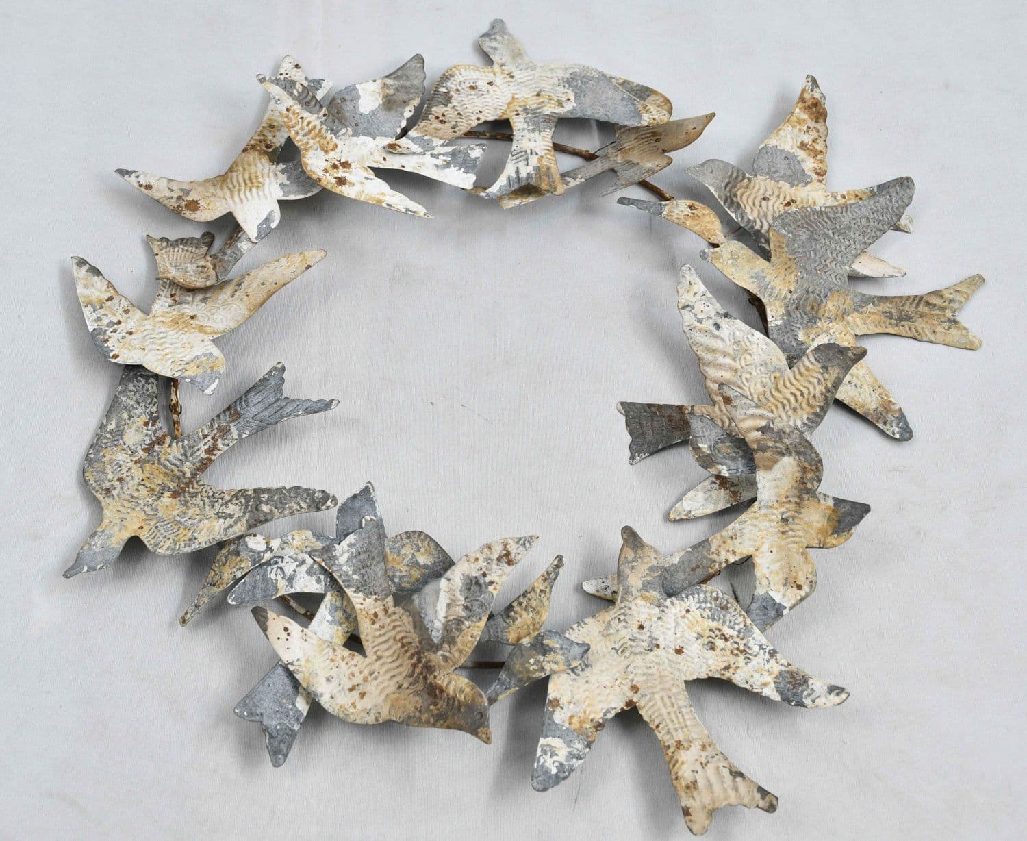 This ornate iron wreath captures a poetic stillness, with finely crafted birds seemingly frozen in graceful flight. Its antique finish, rich in subtle textures, evokes a sense of timeless beauty and quiet nostalgia. Delicate yet enduring, the wreath brings a vintage charm that harmonises effortlessly with both rustic and modern interiors—an artful accent that adds a lyrical touch to any wall.