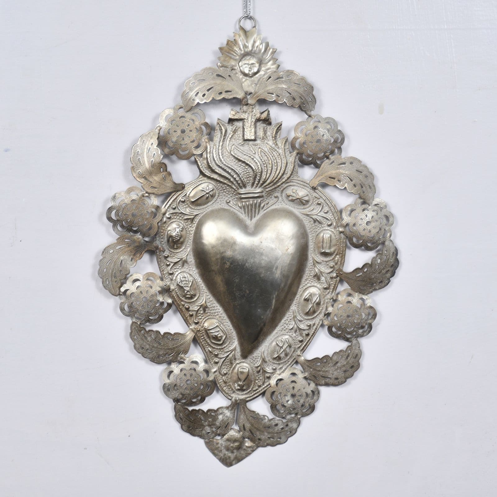 Elevate your walls with these stunning handcrafted distressed motifs, inspired by the tradition of Ex-votos (or Milagros), symbols of devotion and gratitude. Perfect as a heartfelt gift for a loved one, these pieces are crafted from embossed metal and finished with a hand-patinated effect, exuding timeless charm and character. A unique addition to any space, this decorative piece shines as part of an eclectic gallery wall, effortlessly blending with other art to create a magical and captivating display. Please note, as a handcrafted product, slight variations in shape and patina color may occur, making each piece truly one of a kind.