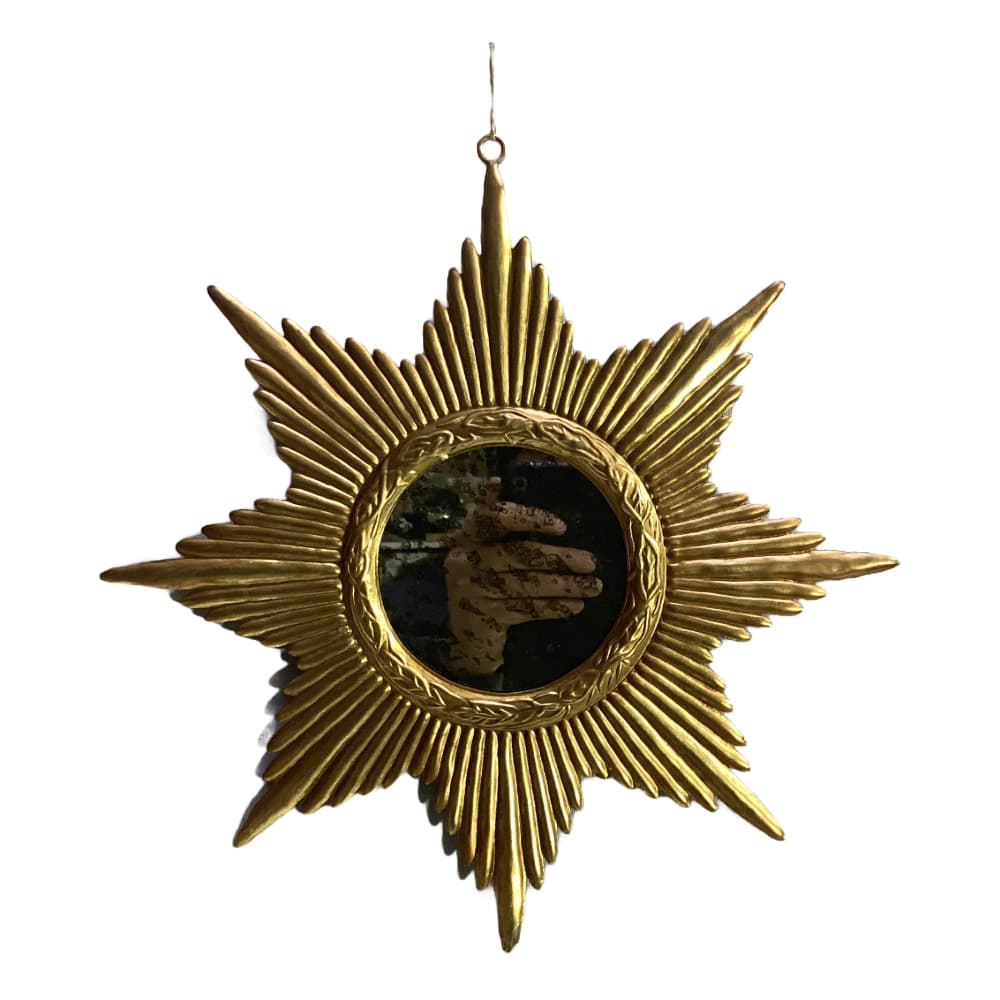Add a bold touch to your space with this striking ray mirror, handcrafted in metal. Featuring a radiant sunburst design, its sculptural form brings light, energy, and a touch of vintage glamour to any wall. Perfect as a statement piece in an entryway, living room, or above a mantel.